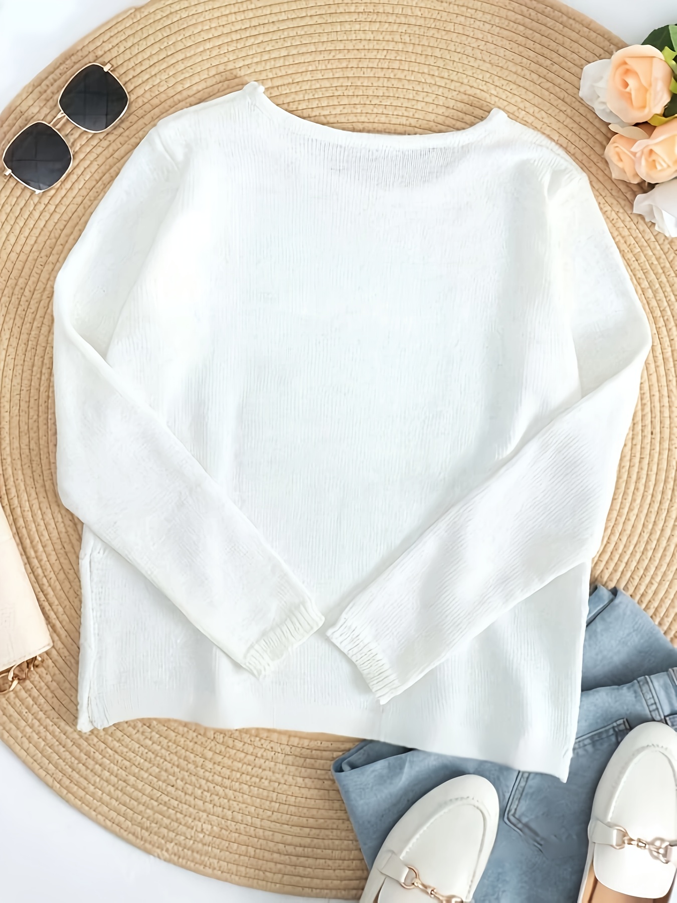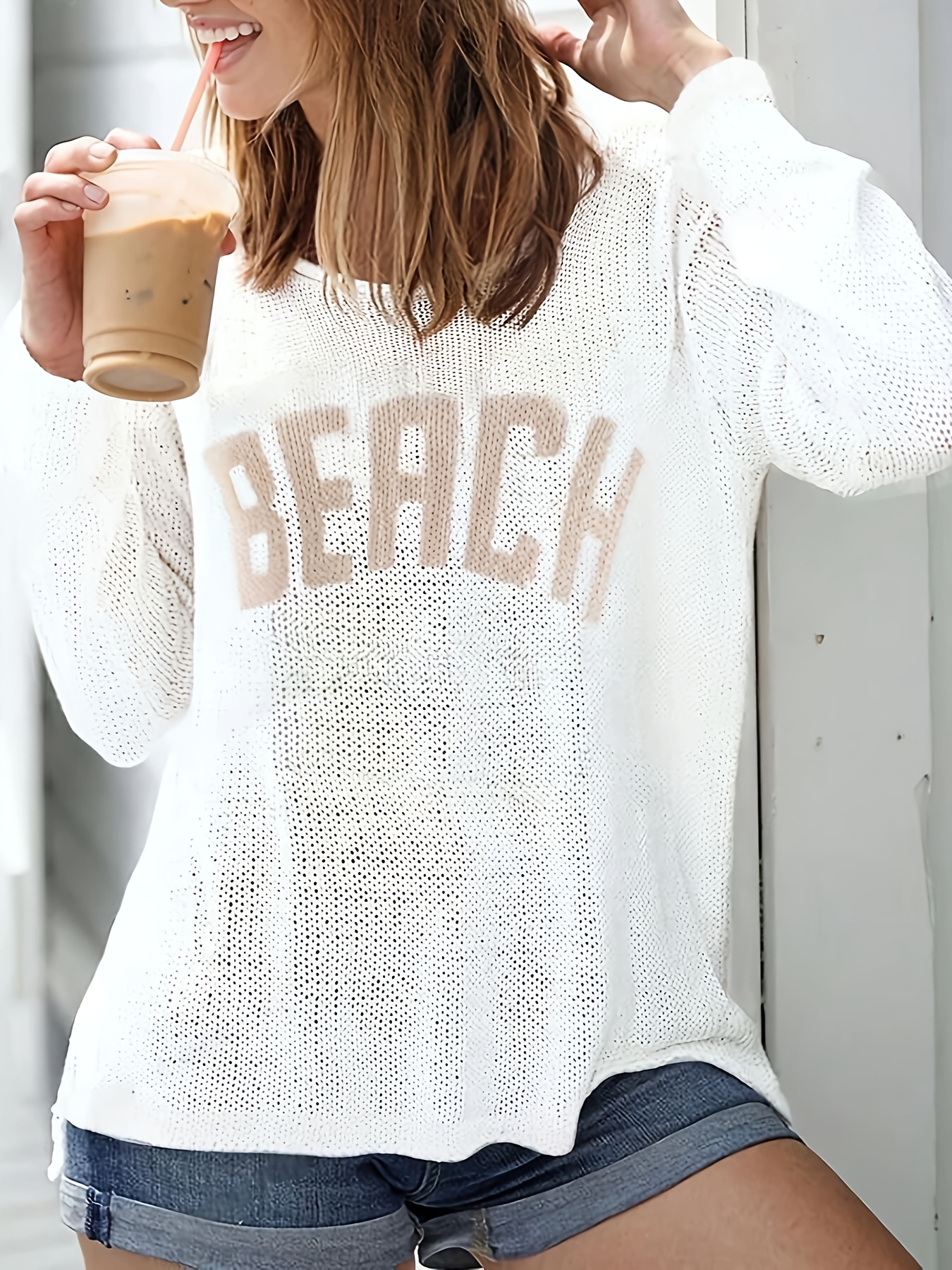 Women's Casual Oversized Crew Neck Pullover Sweater, 100% Polyester Knit Fabric, Solid Color, Lightweight & Breathable, All-Season Versatile Top with "BEACH" Texture Design, Casual Wear | Beachthemed Apparel | Lightweight Swe