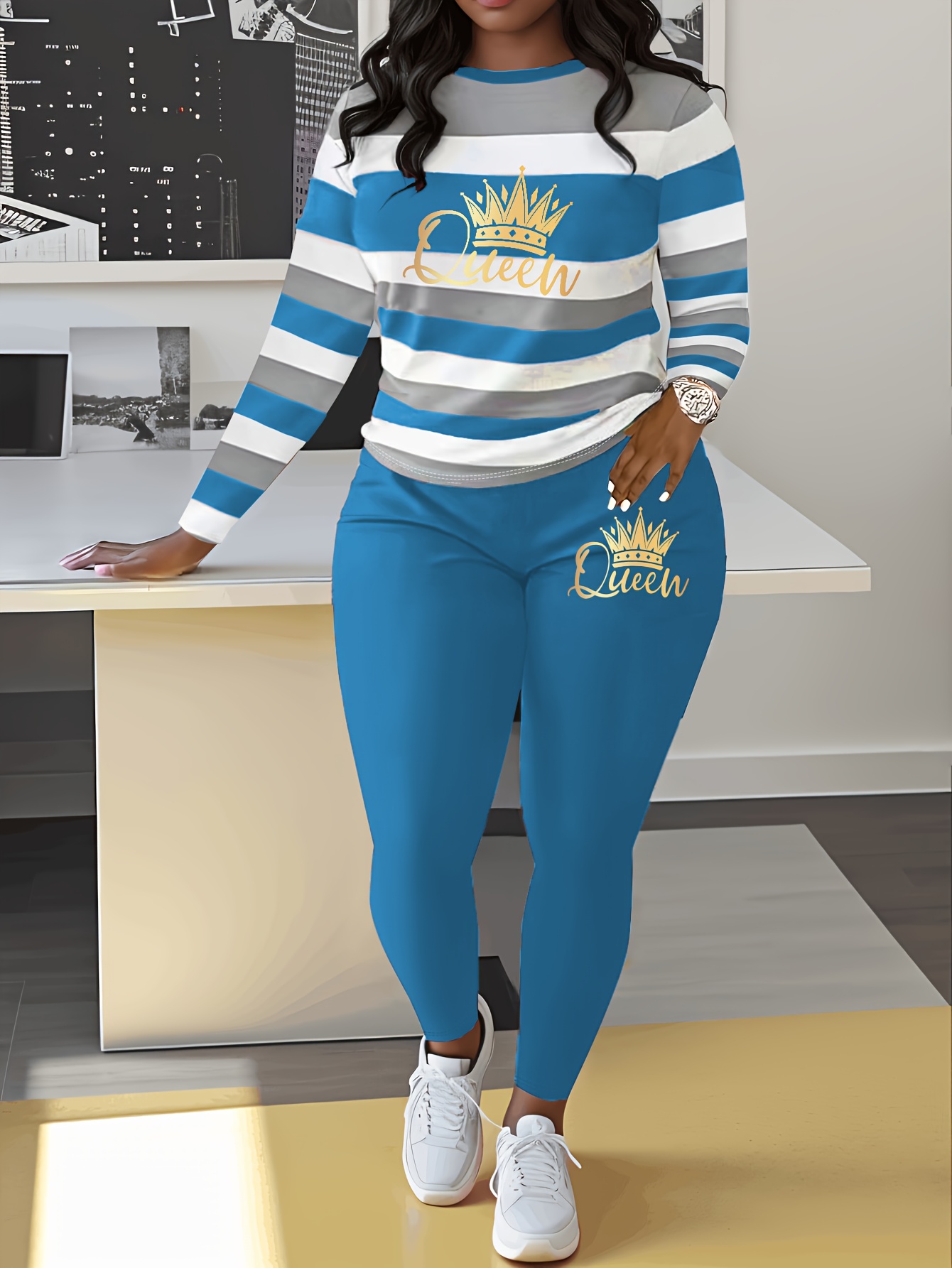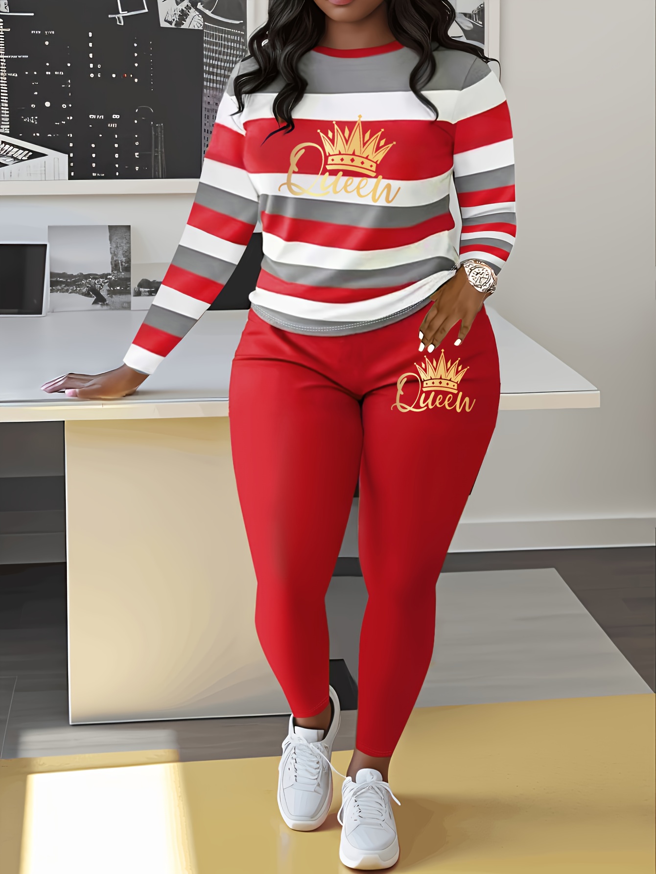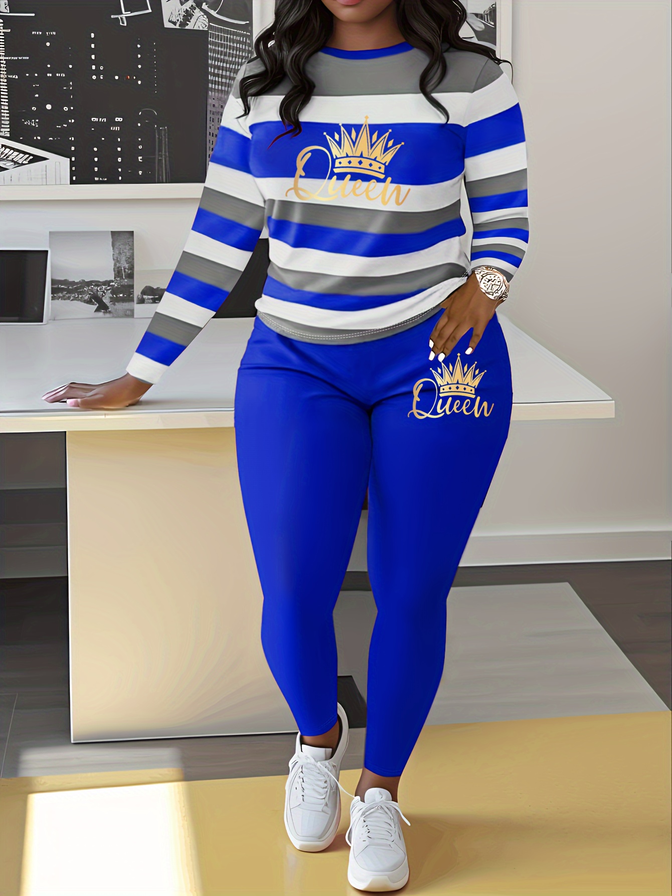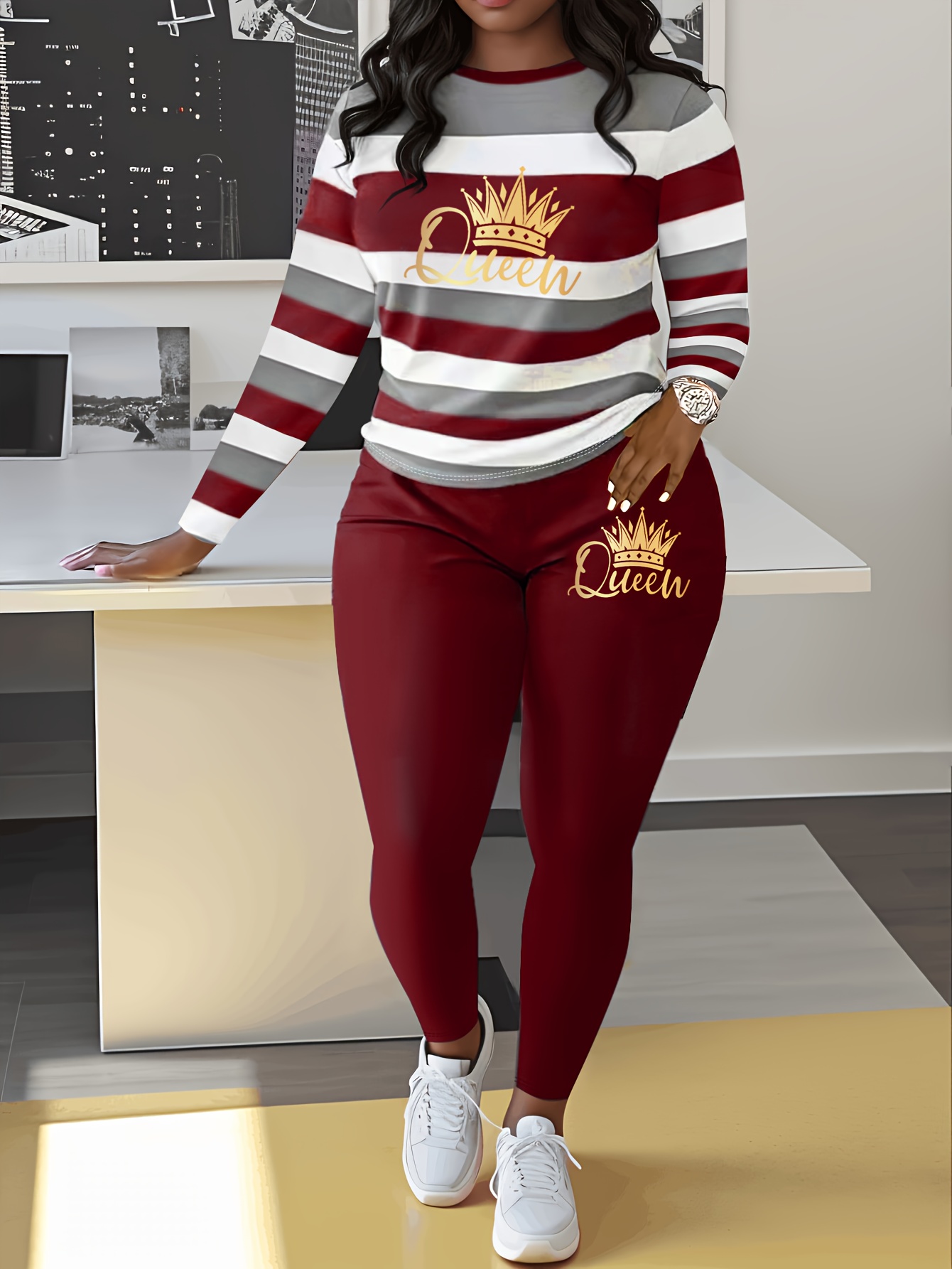 Women's Striped Crown Print Casual Tracksuit Set - Polyester & Elastane Knit Crew Neck Long Sleeve Top with Pants, No Belt - Fall/Winter Cozy Loungewear Suit (1 Top + 1 Pants)