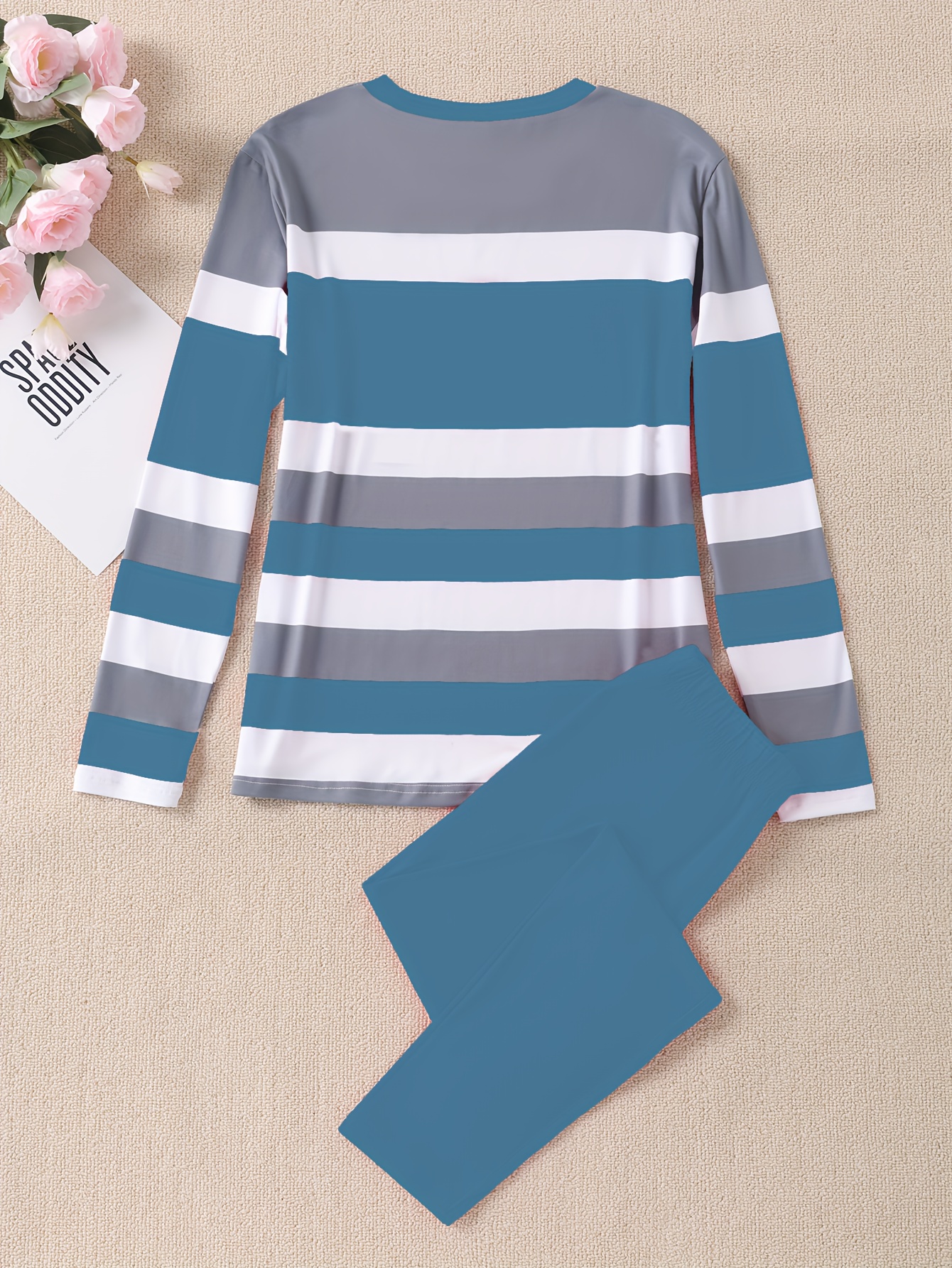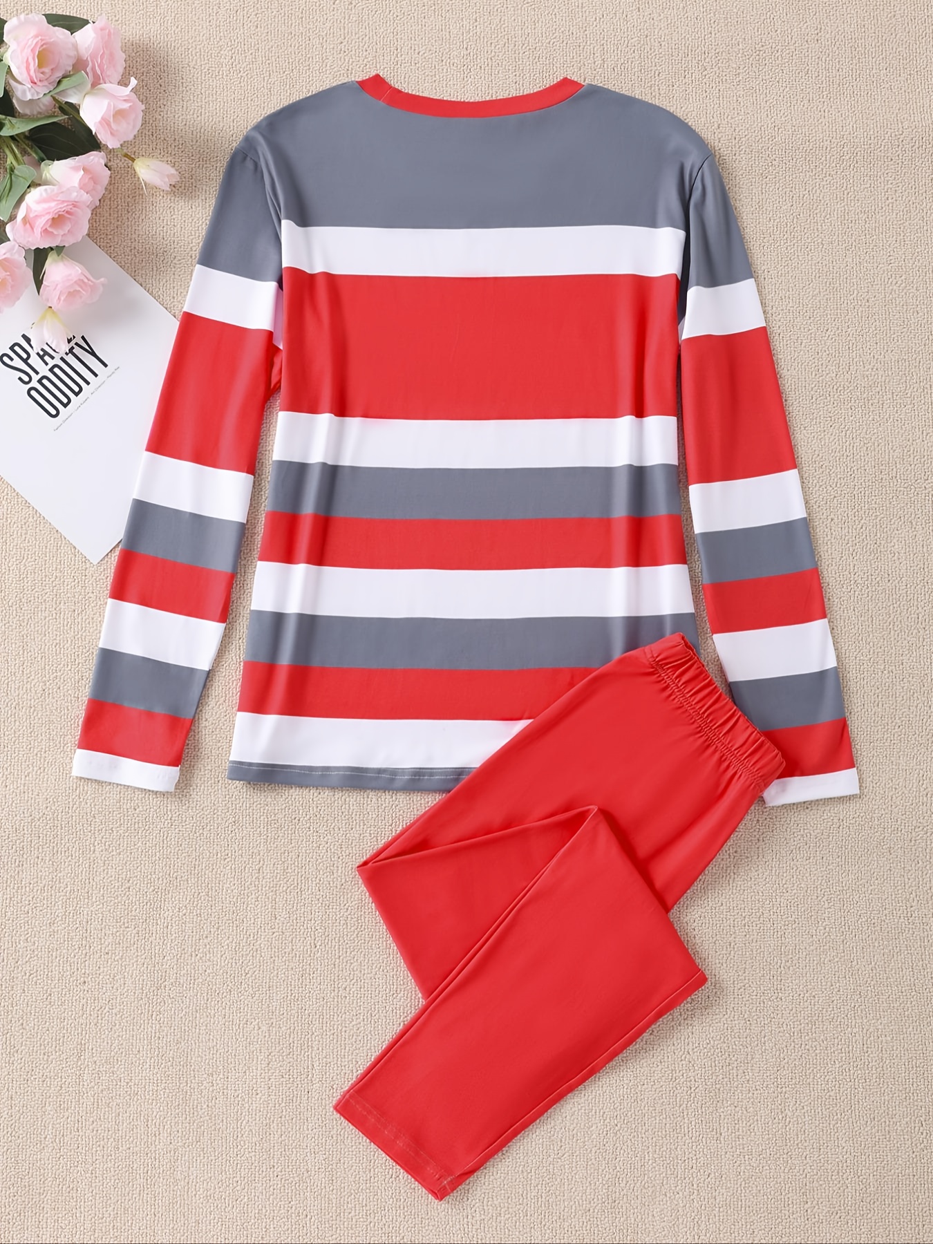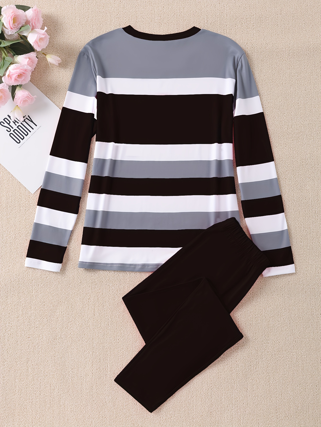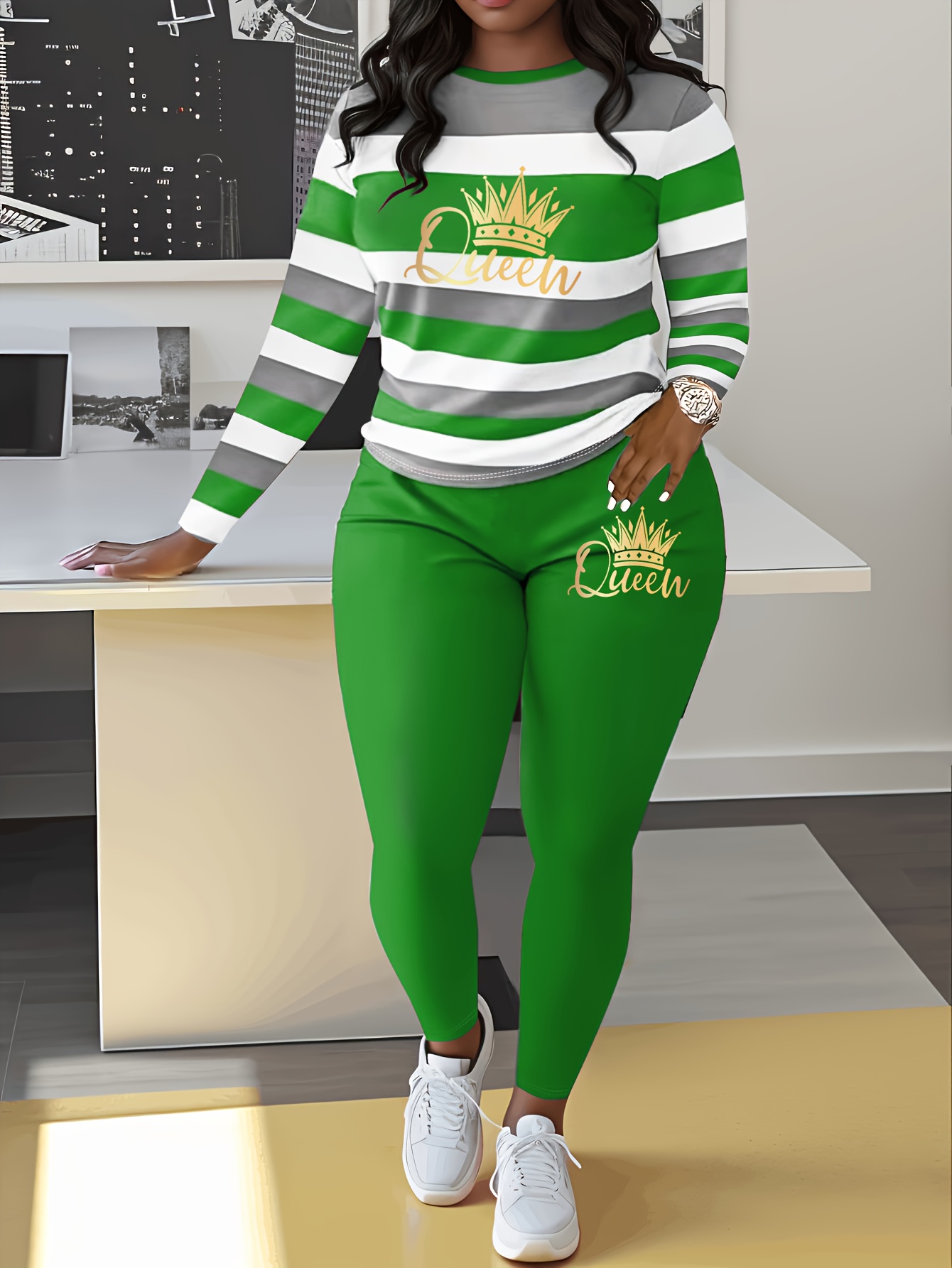 Women's Striped Crown Print Casual Tracksuit Set - Polyester & Elastane Knit Crew Neck Long Sleeve Top with Pants, No Belt - Fall/Winter Cozy Loungewear Suit (1 Top + 1 Pants)